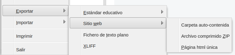 Esta opción permite exportar el proyecto como un sitio web listo para ser alojado en un servidor de Internet. Además de las páginas desarrolladas, se creará un menú de navegación lateral que reproduce el árbol de contenidos del objeto.